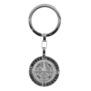 Portachiavi in acciaio, rosa dei venti con zirconi neri.