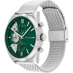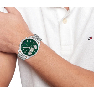 Orologio da uomo di Tommy Hilfiger della collezione Baker. La cassa è in acciaio inossidabile di forma tonda e di colore argento. La dimensione della cassa è di 44 mm e il quadrante è di colore verde. Il cinturino è in acciaio inossidabile 316L di colore argento. Il display è analogico e il movimento è multifunzione. La resistenza all'acqua è di 5 ATM. La referenza è: 1710647