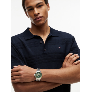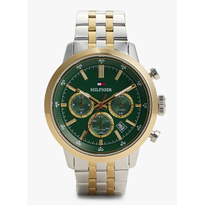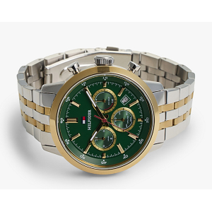 L'orologio cronografo multifunzione con quadrante verde si distingue per il raffinato design bicolore in acciaio inossidabile dalla finitura dorata.