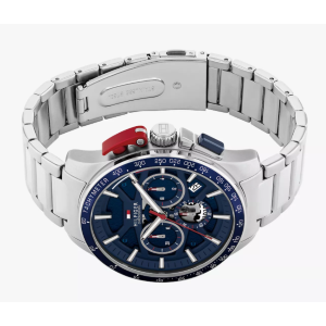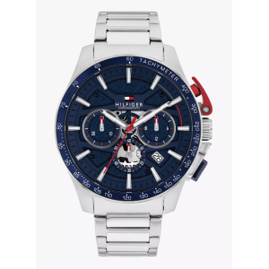 Orologio da uomo Tommy Hilfiger. Il nostro ultimo orologio sportivo combina dettagli audaci con una maestria artigianale snella. Presenta un quadrante a scheletro dimensionale con indici smussati, completato da un trio di sotto-quadranti che mostrano registri feriali, 24 ore e data. Ancora meglio, è dotato di movimento cronografico e può funzionare come un cronometro affidabile.