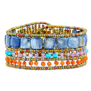 Una colorata, sottile e classica Ziio manchette con tre file di pietre diverse. La fila principale presenta pietre quadrate e piatte di Cianite. Al centro si trova un mix di piccole ametiste rotonde e perline a bottone turchese stabilizzate. L'ultima fila presenta una piccola cornelina rotonda. Il braccialetto Snake Rainbow fatto a mano è regolabile grazie al suo gemello Ziio.